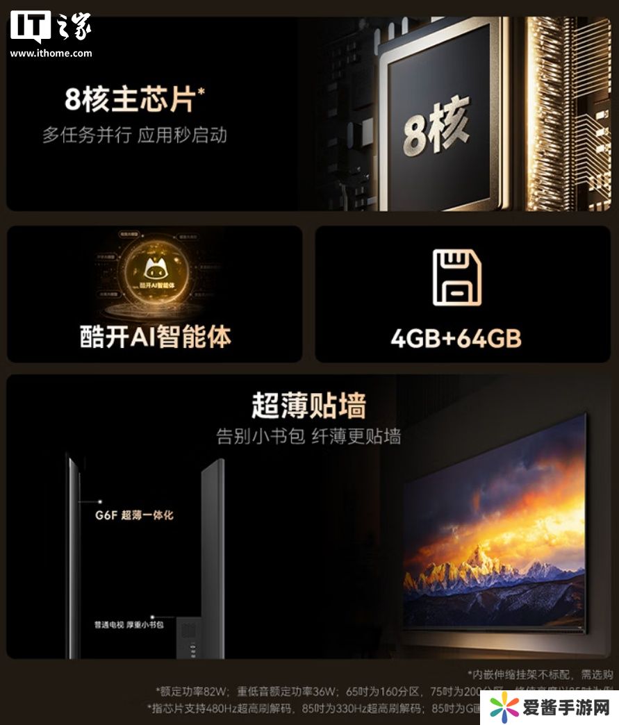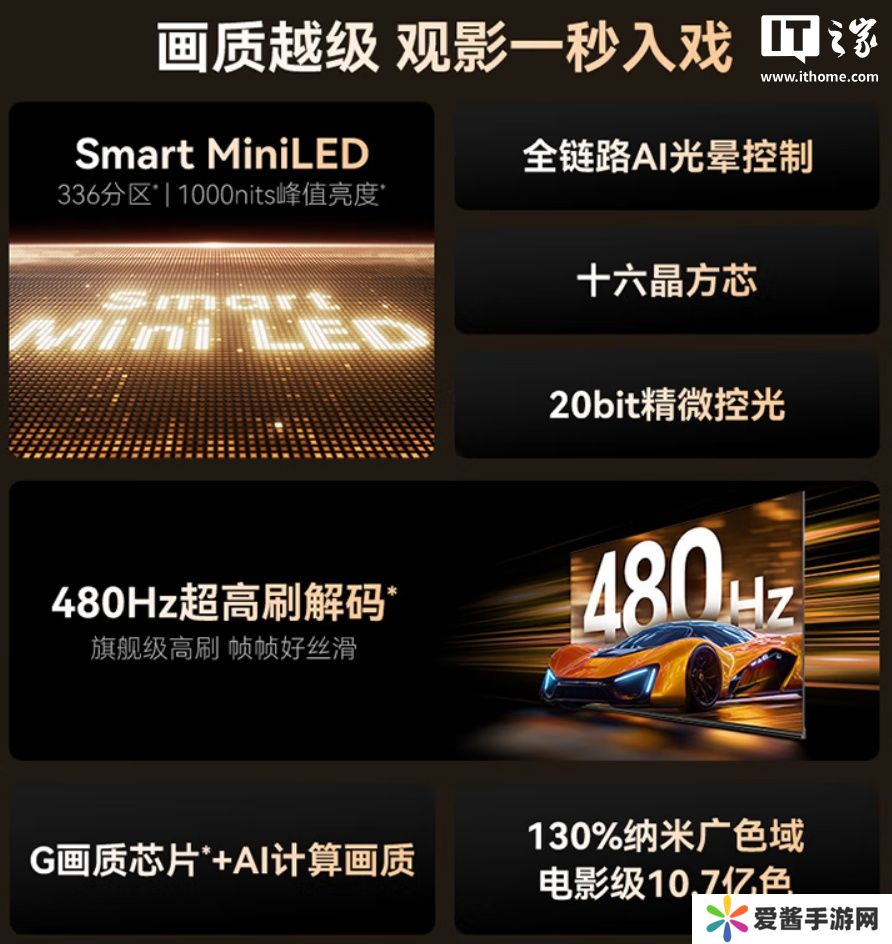 画面部分,该电视配有 Smart Mini LED 屏,峰值亮度达 1000 尼特,芯片支持 480Hz 超高刷解码(85 英寸实际 330Hz),配有 4GB + 64GB 存储。