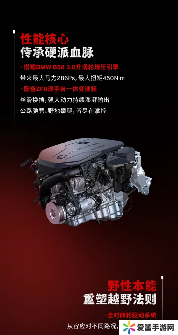 动力方面,英力士掷弹兵红魔限量版搭载了宝马 B58 3.0T 汽油发动机,最大功率达到 210 千瓦,最大扭矩为 450 牛・米,匹配 8 速自动变速箱和全时四驱系统。此外,英力士掷弹兵在海外市场还提供 3.0T 柴油发动机供用户选择。
