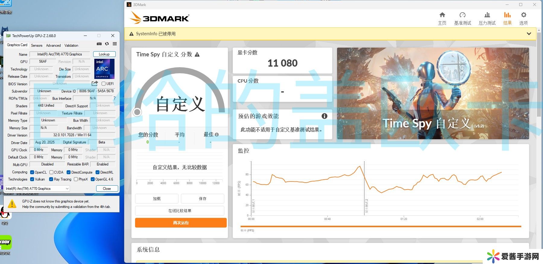 这张显卡的 PCI ID 为 "56AF",显示其实际上是 Arc A760A;但其不支持通用驱动程序,在强制使用 Arc A770 信息后在 3DMark Time Spy 中取得了 11080 的显卡分数,低于核心规模相当的 Arc A570 8GB。