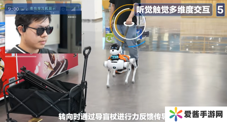 “灵犀”电子导盲犬背载导盲杖物理引导反馈,通过无延迟物理力获取导盲犬转向、加减速和停止等所有运动意图;视障人群配备骨传导蓝牙耳机实时接收机器狗反馈信息并不影响环境音收听。此外,导盲犬会简要概括信息,以最适合用户的语速播报。