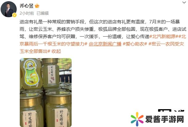 北汽新能源极狐品牌用户运营中心副总经理乔心昱发文称:“进店有礼是一种常规的营销手段,但这次的进店有礼更有温度,7 月末的一场暴雨,让密云玉米、养蜂农户损失惨重,极狐品牌全部包圆,现在极狐客户、进店试驾、维修保养客户均可获赠,一次援手,一份温暖,让爱心传递”。