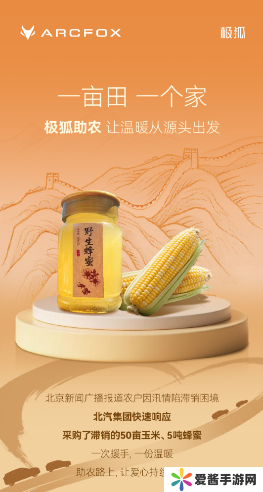 本站 8 月 3 日消息,极狐汽车今日发文称,北京新闻广播报道密云农户汛期陷滞销困境后,北汽集团快速响应,采购了滞销的 50 亩玉米 + 5 吨蜂蜜。若身边有滞销助农需求,请随时联系,极狐汽车愿继续伸出援手。