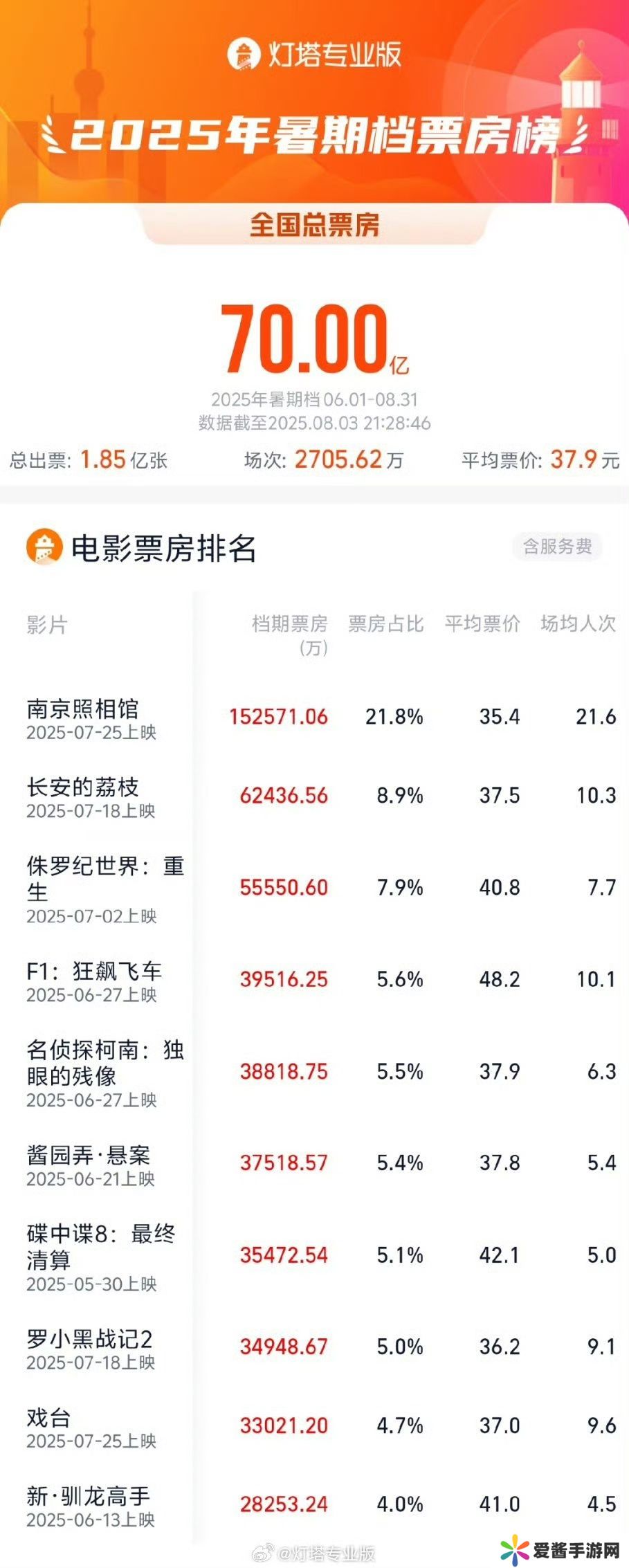 本站 8 月 3 日消息,据灯塔专业版,截至 8 月 3 日 21 时 28 分,2025 年暑期档(6 月-8 月)总票房(含预售)突破 70 亿!《南京照相馆》《长安的荔枝》《侏罗纪世界:重生》暂列档期票房前三名。