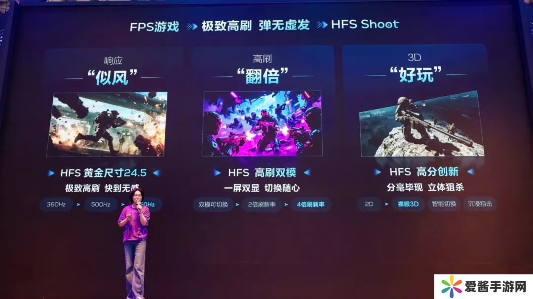 HFS Shoot:通过光配向工艺可同时实现高分辨率 + 高刷新率 + 高画质的“三高”优势,全面覆盖 FPS 游戏各类型玩家的需求;兼顾“竞技 + 影音娱乐 + 美学设计”**需求,一键切换高刷双模;支持一键切换 2D / 3D 显示,在柱透镜裸眼 3D 技术加持下,沉浸畅玩。