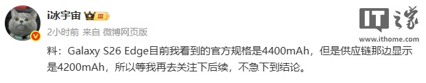 本站 8 月 4 日消息,博主 @i冰宇宙 今日爆料称,三星 Galaxy S26 Edge 目前看到的官方规格是 4400mAh,但是供应链那边显示是 4200mAh。不过,该博主也提到再去关注下后续,不急下结论。