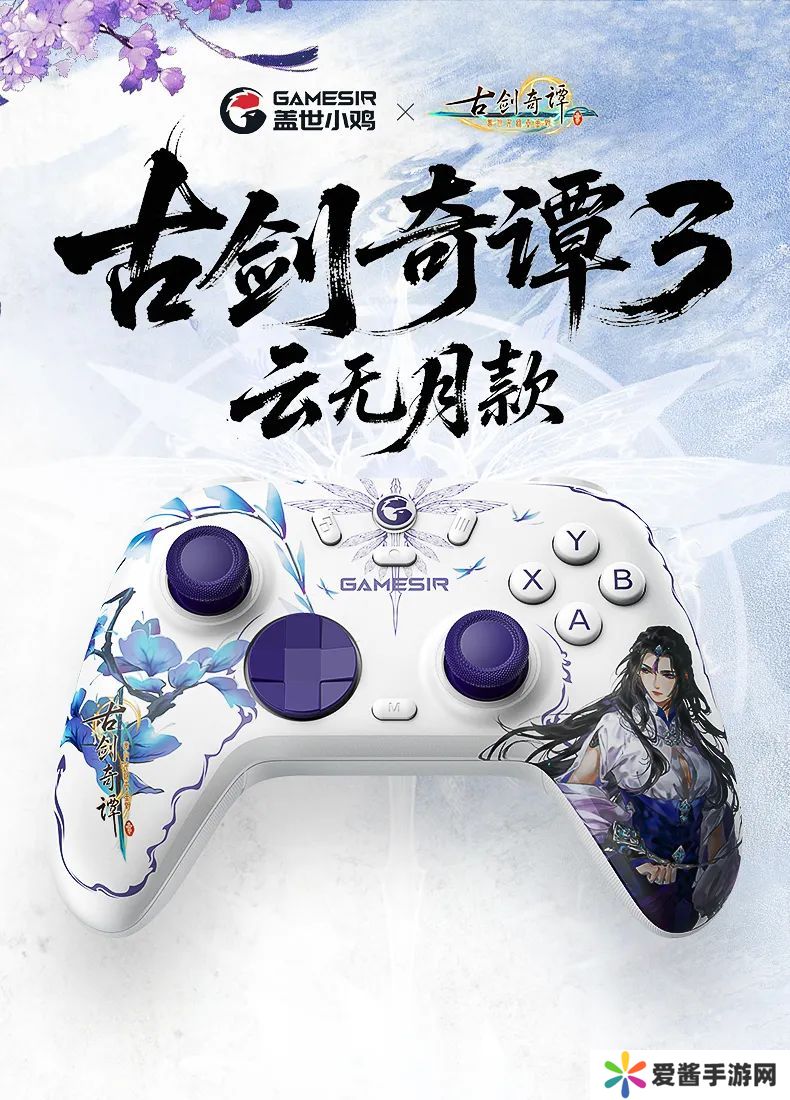 《古剑奇谭 3》联名款:以仙侠奇幻题材为核心,定制云无月主题。在白色的基调上,采用云无月标志性的蓝紫色,呼应角色的清冷气质。中间印刻的辟邪族纹,梦蝶飞舞环绕。左握把处刺荆心花缠绕,《古剑奇谭 3》的标志点缀其中;右握把呈现经典主角云无月形象。