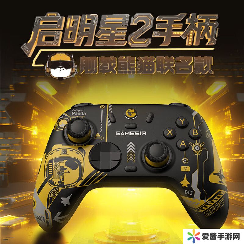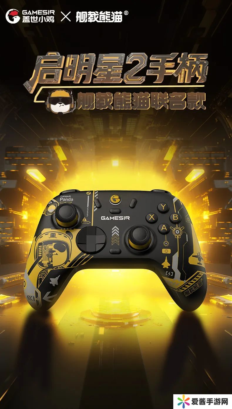 舰载熊猫联名款:舰载熊猫的设计,是以中国航母舰员和飞行员作为灵感,一改传统熊猫创作的萌系风格。舰联名款里身穿帅气黄马甲的舰载熊猫,就是舰上的指挥员,通过使用特有手势去传递信号。手柄本体采用沉稳的黑为主色调,辅以“明星”战位黄马甲色调,手柄侧面的熊猫头戴金色的飞行头盔。