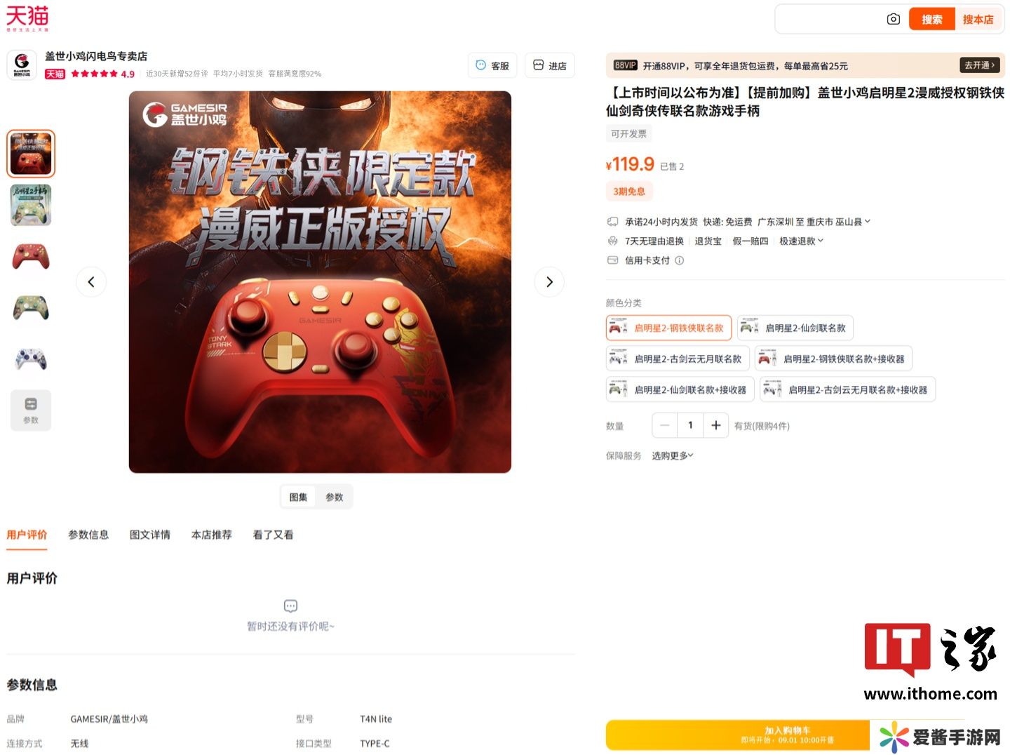 本站 8 月 4 日消息,小鸡启明星 2 × 漫威钢铁侠联名款手柄已正式亮相,新手柄外观以钢铁侠为灵感,采用标志性红金配色,科技感线条勾勒铠甲形态,胸前的方舟反应堆图案点缀。目前新品已上架淘宝(京东暂未上架),将于 9 月 1 日 10:00 正式开售,定价 119.9 元。