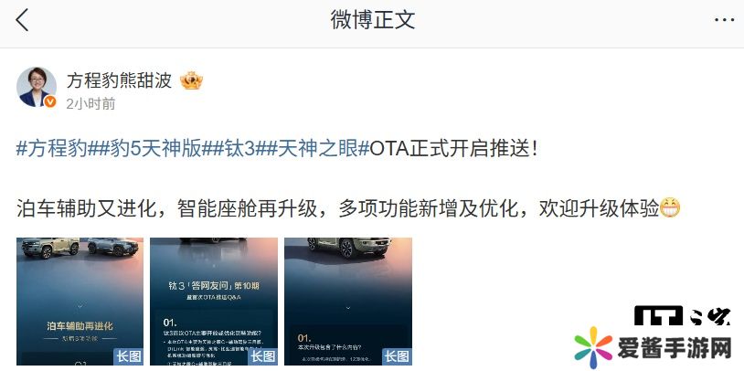 本站 8 月 4 日消息,据比亚迪集团-方程豹事业部总经理熊甜波分享,方程豹豹 5 天神版、钛 3 全系车型开启 OTA 推送,新版本泊车辅助进化、智能座舱升级,同时有多项功能新增及优化。