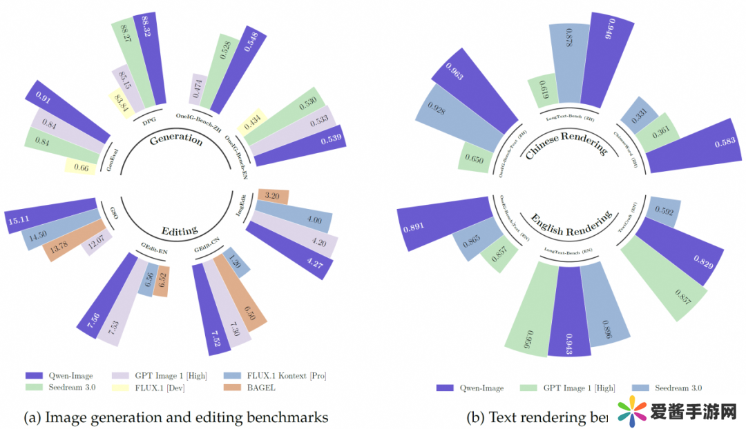 跨基准性能表现:在多个公开基准测试中的评估表明,Qwen-Image 在各类生成与编辑任务中均获得 SOTA。