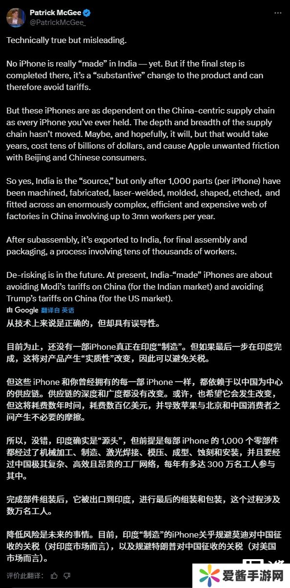 麦吉称,“但这些 iPhone 与你曾拿过的每一部 iPhone 一样,都依赖以中国为核心的供应链。供应链的深度和广度并未改变。也许,也希望它会改变,但这需要数年时间,花费数百亿美元,并会给苹果带来与北京方面及中国消费者不必要的摩擦。所以,没错,印度是‘源头’,但前提是(每部 iPhone 的)1000 个零部件已经在中国一个极为复杂、高效且成本高昂的工厂网络中完成加工、制造、激光焊接、模塑、成型、蚀刻和组装,这个网络每年涉及多达 300 万名工人。完成零部件组装后,产品会出口到印度进行最终组装和包装,这一过程涉及数万名工人。降低风险是未来的事。目前,印度‘制造’的 iPhone 手机主要是为了规避莫迪针对中国的关税(面向印度市场)以及特朗普针对中国的关税(面向美国市场)。”