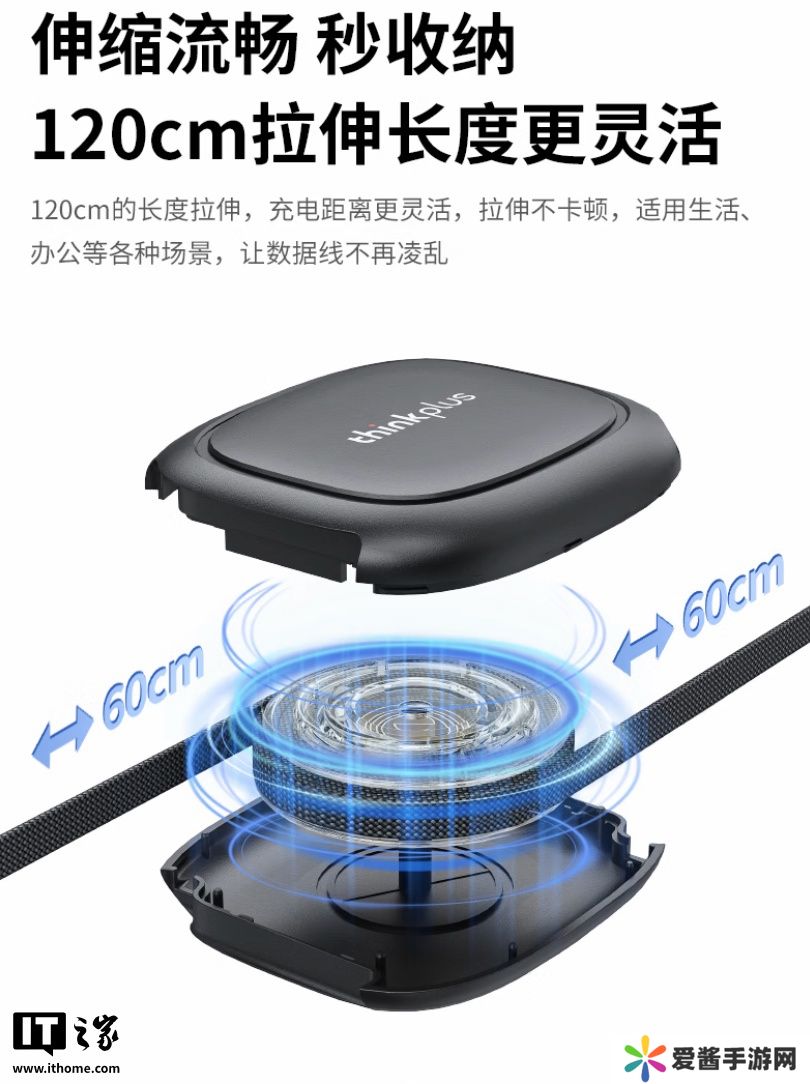 据介绍,这一产品采用中部理线盒结构,两端各可拉伸出 60cm,总长来到 120cm,并支持无极拉伸和磁吸回收。