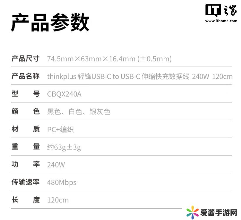 其中,产品配备的 240W 伸缩线总重约 63g,厚度约 16.4mm,配备 1.5mm 薄型数据线,接口端采用网尾设计,通过 1 万次弯折、2 万次插拔测试。支持 USB PD 3.2 240W 快充并支持联想拯救者游戏硬件、moto 移动设备的私有快充协议,若用于传输数据则为 USB 2.0 480Mbps 规格。