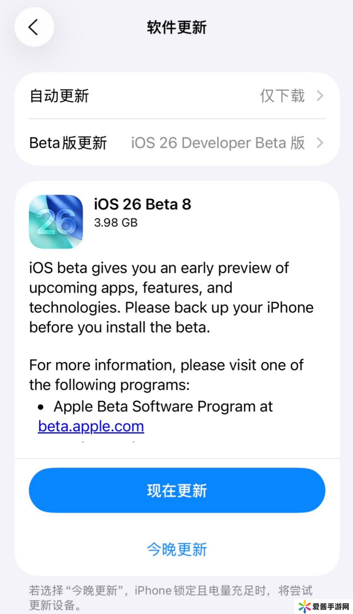 • 公开测试版:需注册Apple Beta 版软件计划,之后通过【设置】【通用】【软件更新】【Beta 版更新】来升级;