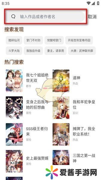 2、接着在头部搜索框输入作品或者作者名,点击“确认”或者“搜索”;