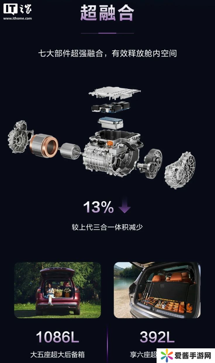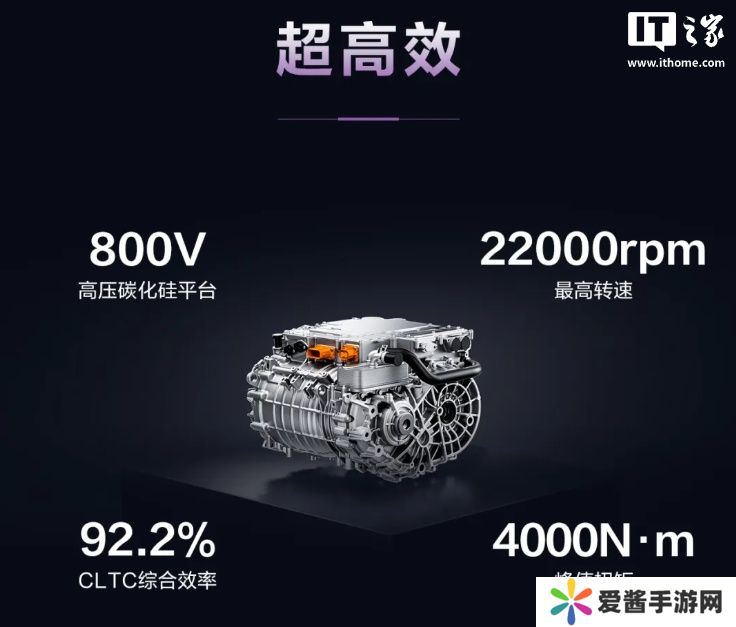 据介绍,华为 DriveONE 高压七合一电机采用七大部件融合设计,可有效释放舱内空间,体积较上一代三合一减少 13%,该电机采用 800V 高压碳化硅平台,支持最高 22000rpm 转速、4000N・m 峰值扭矩,CLTC 综合效率 92.2%。