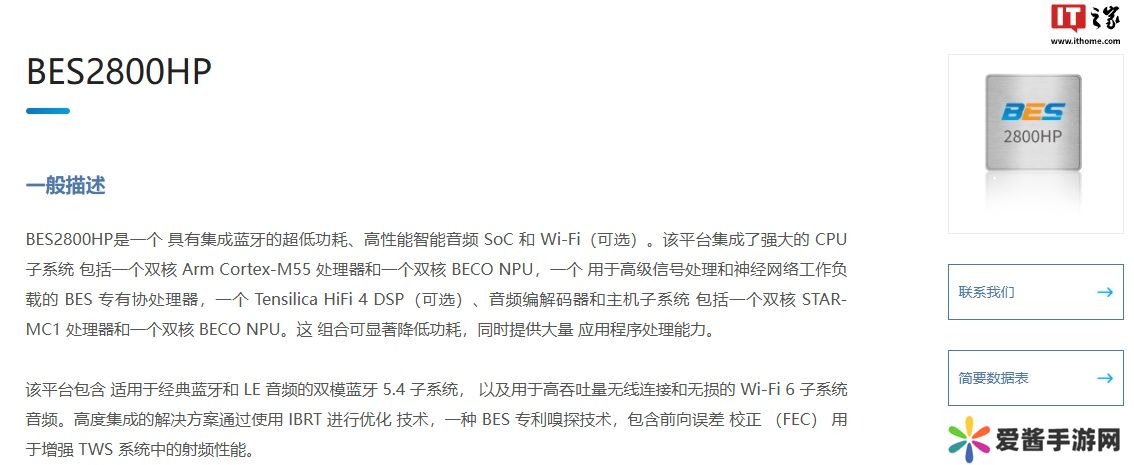 本站查询恒玄科技官网获悉,BES2800HP 是一个具有集成蓝牙的超低功耗、高性能智能音频 SoC 和 Wi-Fi(可选)。该平台集成了 CPU 子系统包括一个双核 Arm Cortex-M55 处理器和一个双核 BECO NPU,一个用于高级信号处理和神经网络工作负载的 BES 专有协处理器,一个 Tensilica HiFi 4 DSP(可选)、音频编解码器和主机子系统包括一个双核 STAR-MC1 处理器和一个双核 BECO NPU。