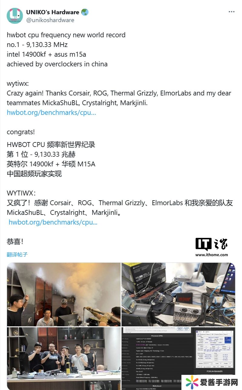 本站注:全球 CPU 最高频率此前纪录由英特尔酷睿 i9-14900KS 创造,wytiwx 本次超频酷睿 i9-14900KF 处理器,电压提高到 1.388V 下确保稳定输出,最终以 13 MHz 的优势刷新纪录。