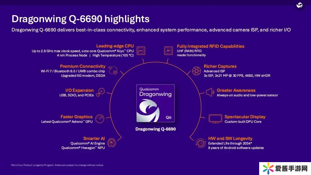 本站 8 月 27 日消息,高通公司昨日(8 月 26 日)发布公告,宣布推出跃龙(Dragonwing)Q-6690,这是全球首款将超高频射频识别(UHF RFID)功能完全整合入企业级移动芯片的产品。