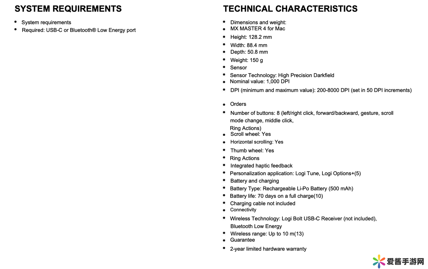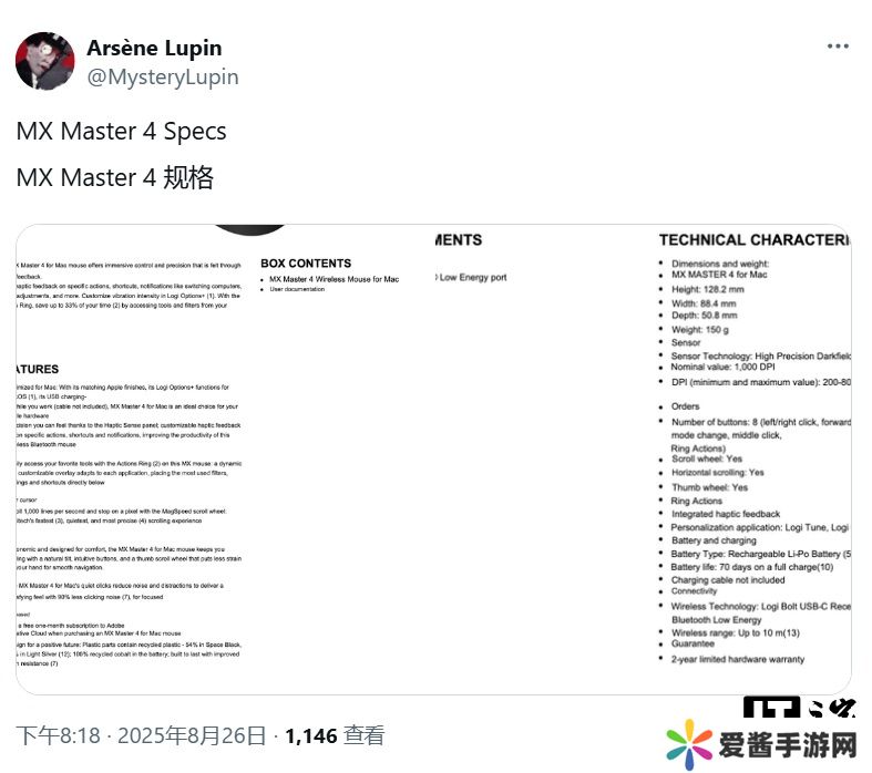 在硬件规格上,新款搭载 Darkfield 高精度传感器,默认 1000 DPI,可在 200-8000 DPI 范围内以 50 DPI 为步进进行调节。整机配备八枚可编程按键,其中包括新增的手势功能键与可点击的操作环。连接方式支持 Logi Bolt 接收器及蓝牙,并可同时连接多台设备,提供 PC、Mac 及商务版选择。