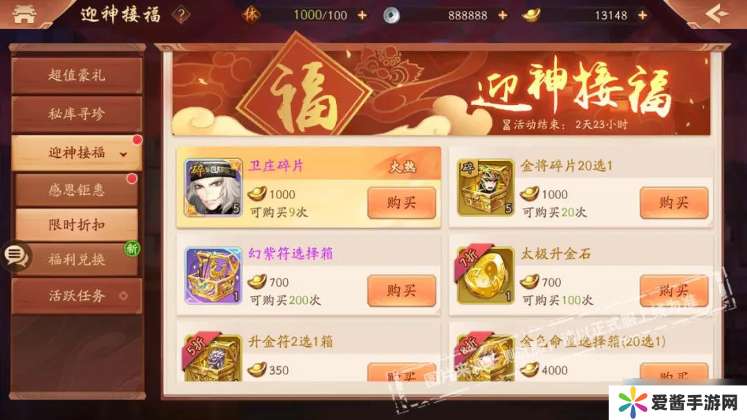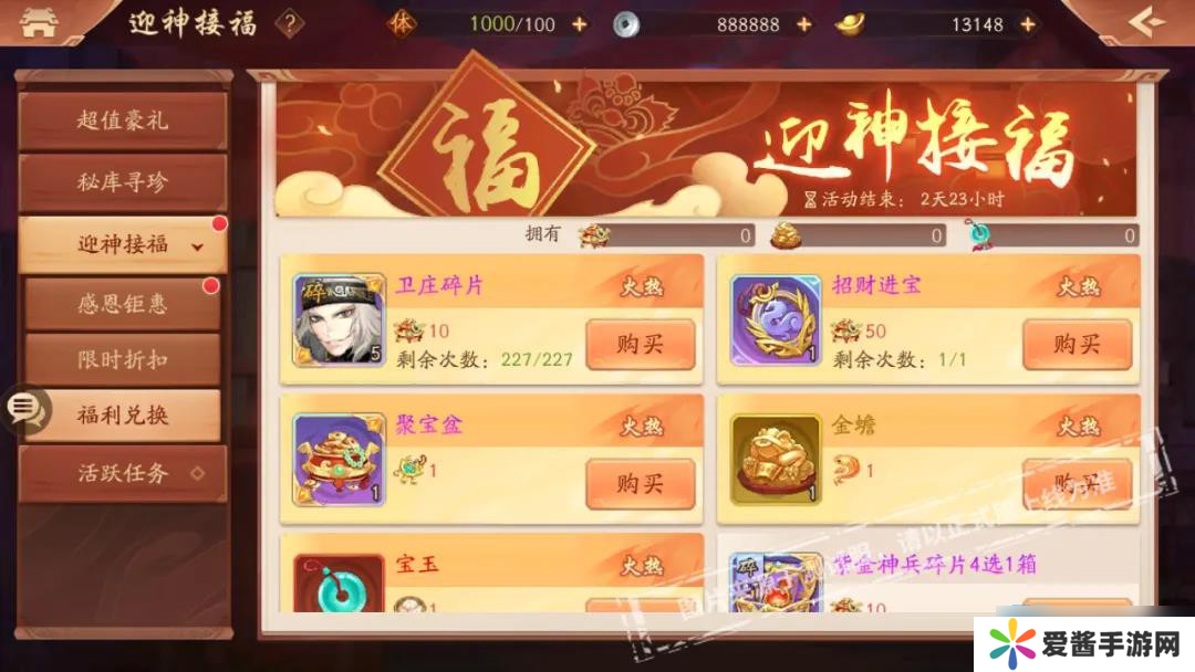 惊喜途径:五福钱抽紫金秘库!参与活动收集“五福钱”,即可在神秘的紫金秘库中抽取丰厚奖励,包括卫庄碎片!切记:活动一结束,所有聚宝盆、五福钱等限定道具将全部清零!犹豫就会败北,务必争分夺秒!