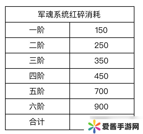 军魂系统总计6阶,每一阶解锁后均从0级开始升级。每一阶满级后可进阶至下一阶继续升级。具体消耗总结如下: