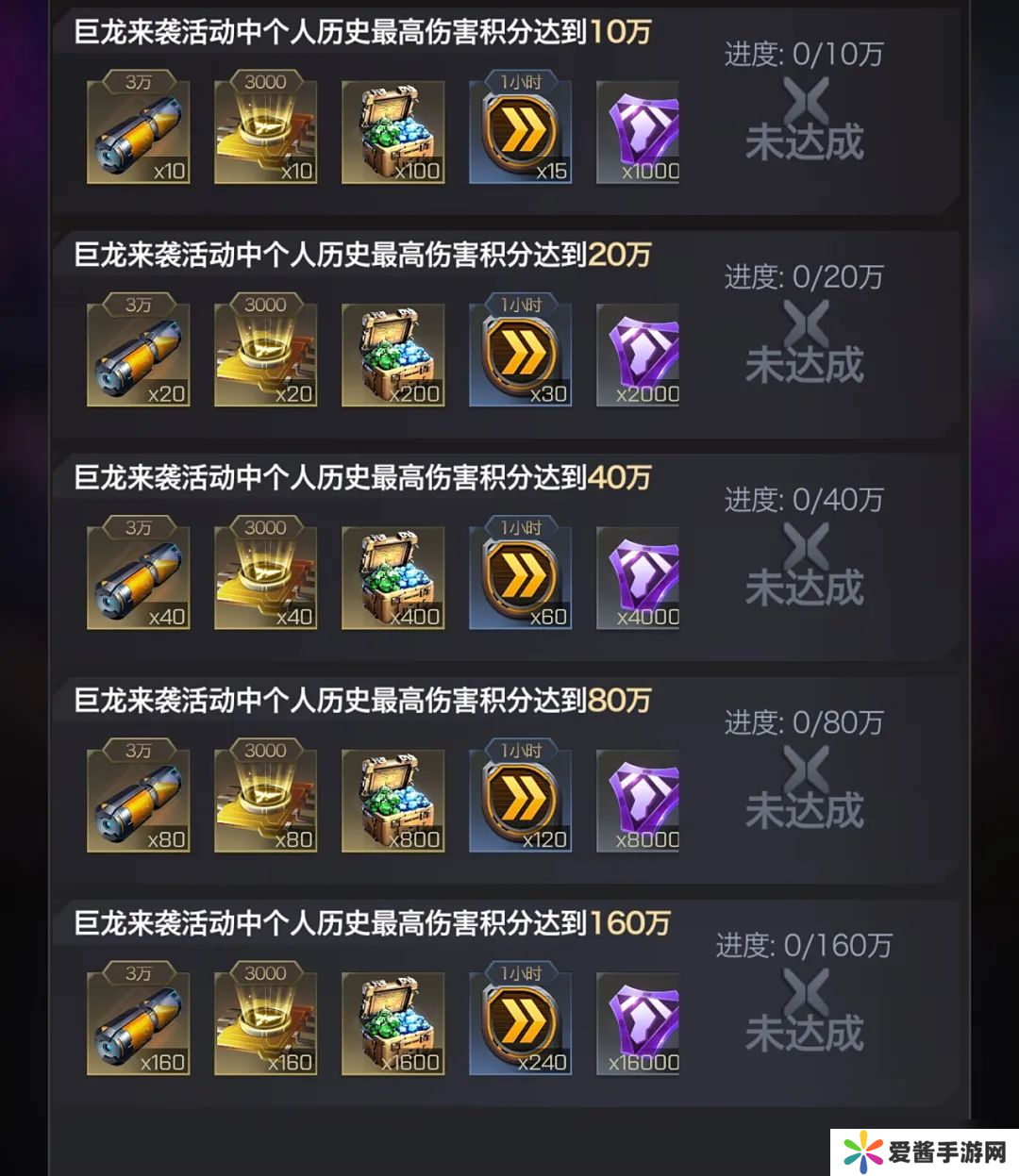 巨龙来袭活动期间,只有联盟盟主和5阶成员可以手动开启或者预约开启【巨龙来袭】活动,在活动开启前,联盟需放置【巨龙陷阱】,如果活动开启前【巨龙陷阱】被拆除,将无法正常开启活动,需重新放置。需要注意的是:盟主和5阶成员可多次修改预约时间,但是距离最后一次预约时间小于5分钟时不可修改预约时间,注意规划好时间!巨龙来袭活动奖励活动时间内,指挥官对【变异巨龙】造成伤害后会根据伤害数额获得伤害积分,伤害越高获取的伤害积分越高,伤害积分越高可领取的个人积分奖励越高,具体奖励如下图所示: