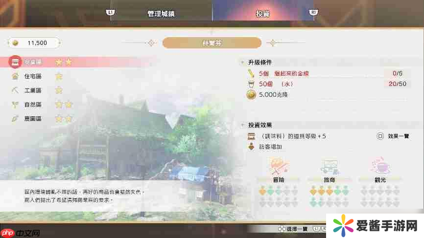 可以对五个区域进行出资,城镇的外观与可利用的商店会依据复兴状况改变,