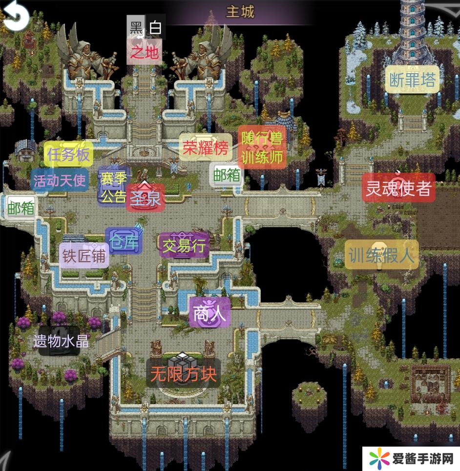 黑白之地黑白之地:主城功能简介如下: 大家好,我是Attempt。本贴是主城功能分布简介,目前更新至S7赛季。希望对你有帮助。 从上往下,从左往右介绍 1.黑白之地:冒险入口 2.断罪...