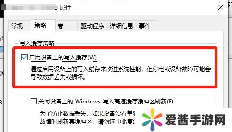 5、最后取消勾选【启用设备上的写入缓存】功能,点击确定按钮即可