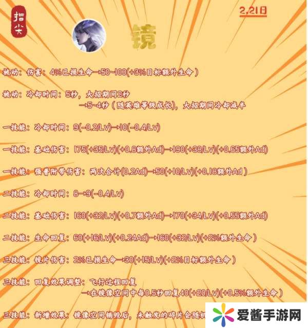 被动技能大招期间冷却减半,且后期降低技能冷却,三个技能的数值全部重新调整,加强基础和成长伤害,削弱AD,降低镜纯输出的高爆发,鼓励走半肉流的玩法。