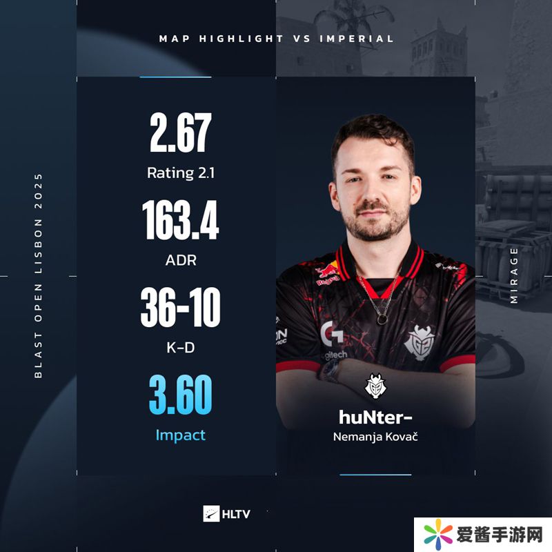 G2战队选手huNter-在Mirage上打出了惊天数据。他在全场有着36-10的K/D和2.67的rating,而这也是他职业生涯中的最佳单图数据。