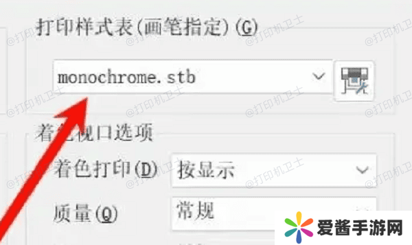 2、在打印样式表(CTB或STB)下拉菜单中,选择 monochrome.ctb(黑白打印样式表)。