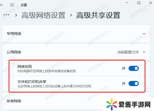 在“专用网络”或“公用网络”中打开“网络发现”和“文件和打印机共享”。