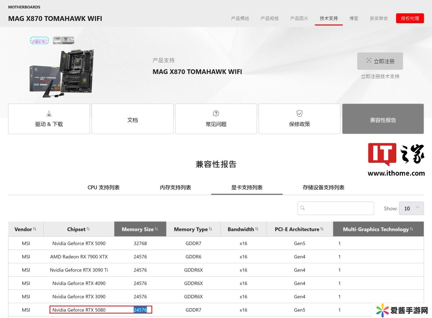 本站 3 月 24 日消息,Reddit 网友 Due-Bee-9574 北京时间昨日发帖表示,微星 MAG X870 TOMAHAWK WIFI“战斧**”主板的海外官网兼容性页面中出现的英伟达 GeForce RTX 5080 显卡显存容量为 24576 (MB),即 24GB,而不是正确的 16GB。