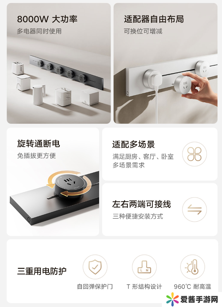 本站从商品页面获悉,这款新品轨道可承载 8000W,单个适配器可承载 2500W,支持更多电器同时使用。新品配备自回弹关闭式保护门,取下适配器后,保护门自动回弹关闭,防止宝宝伸手误触,同时减少油烟、灰尘进入。