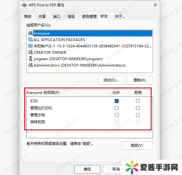 在打印机属性的 安全 选项卡中,检查用户组(如Everyone、Guest)是否拥有打印权限。