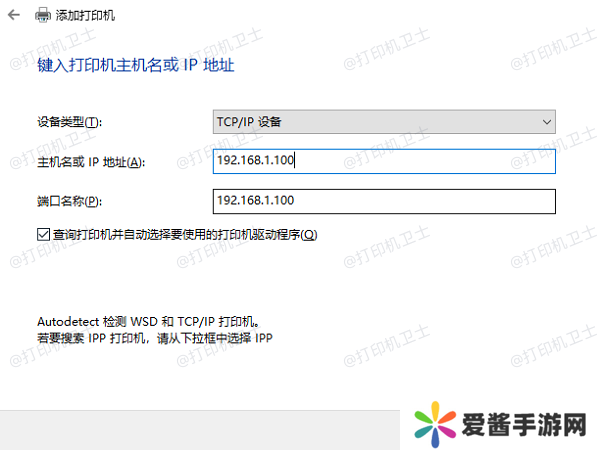 在 主机名或 IP 地址 处输入 192.168.1.100,系统将尝试检测并安装打印机。