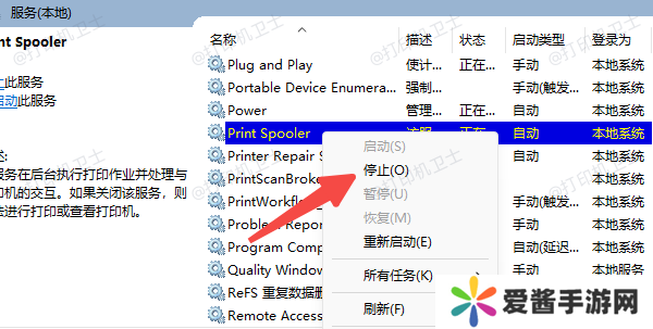 找到“Print Spooler”服务:右键点击,选择“停止”。