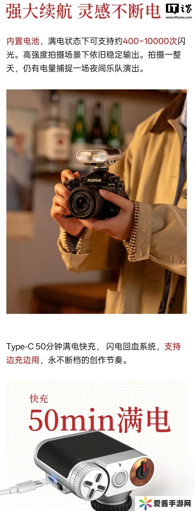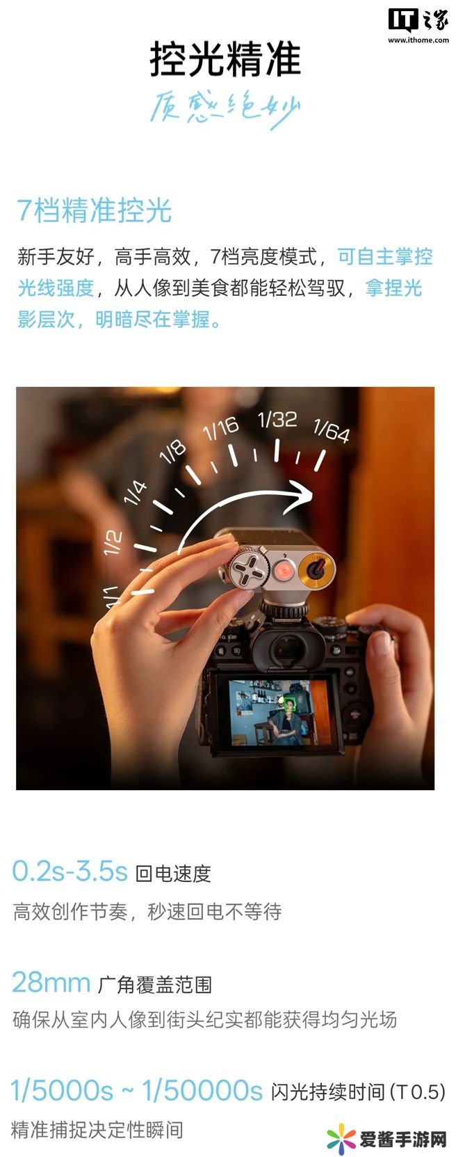 在参数方面,该闪光灯闪光指数 GN12,内置 7 档亮度模式,从 1/64-1/1,回电速度 0.2 秒-3.5 秒,闪光持续时间(T 0.5)1/5000 秒-1/50000 秒;内置两种光引闪模式,S1 模式可实现无线离机触发闪光灯,S2 模式可实现防预闪模式,在多灯协作时可规避频闪干扰;采用内置电池设计,满电状态下可支持约 400-10000 次闪光,充电口为 USB-C,可实现 50 分钟充满电,支持边充边用。