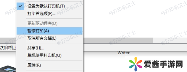 点击“打印机”菜单,确保没有选中“暂停打印”或“脱机使用打印机”选项。