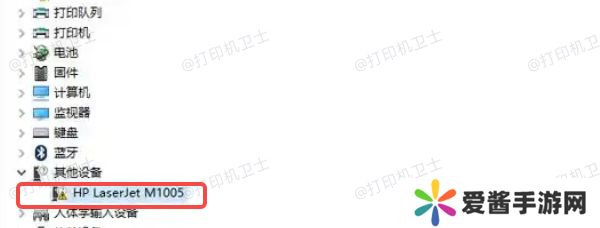 2、在设备管理器中,找到“打印队列”或“其他设备”下的惠普打印机设备。