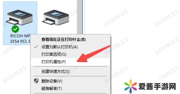 3、右键点击你想要共享的打印机,选择“打印机属性”。