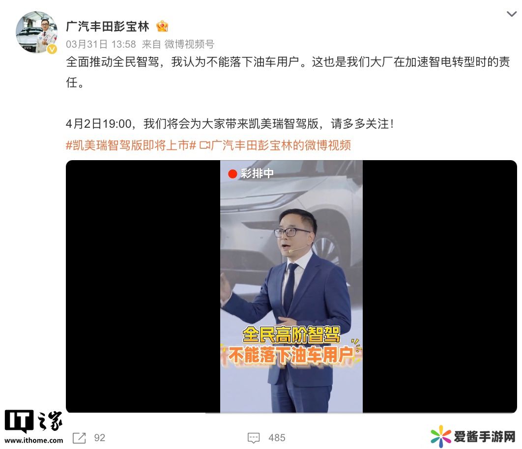 本站4 月 1 日消息,广汽丰田凯美瑞智驾版将于明天(4月 2日)正式上市,官方今天宣布该车将搭载“高阶智驾”系统,预计为 L2 级别辅助驾驶,作为比较,目前在售的广汽丰田凯美瑞搭载 Toyota Pilot 辅助系统,指导价 17.18 万-25.98 万元。