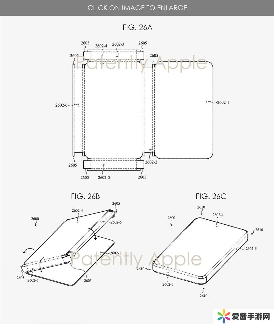 专利图示披露了多项创新设计:图 26A-26C 展示六面透明棱柱外壳,每面均可独立显示内容;图 53B-C 演示手机翻转时,界面会智能迁移至用户正对屏幕;图 51A-B 则呈现了画面从正面延伸至背部的 "穿透显示" 效果。