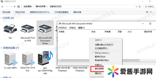 3. 在弹出的窗口中,如果打印机状态显示为“脱机”,您可以点击顶部的“打印机”菜单,查看是否勾选了“脱机使用打印机”的选项。取消勾选此选项后,打印机会恢复为“在线”状态。