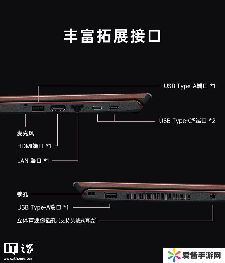 I/O方面,该机左侧配备1个 USB-A 接口、1个 3.5mm 音频接口;右侧配别1个 USB-A接口、1个 HDMI接口、1个 RJ45网口、2个 USB-C接口。