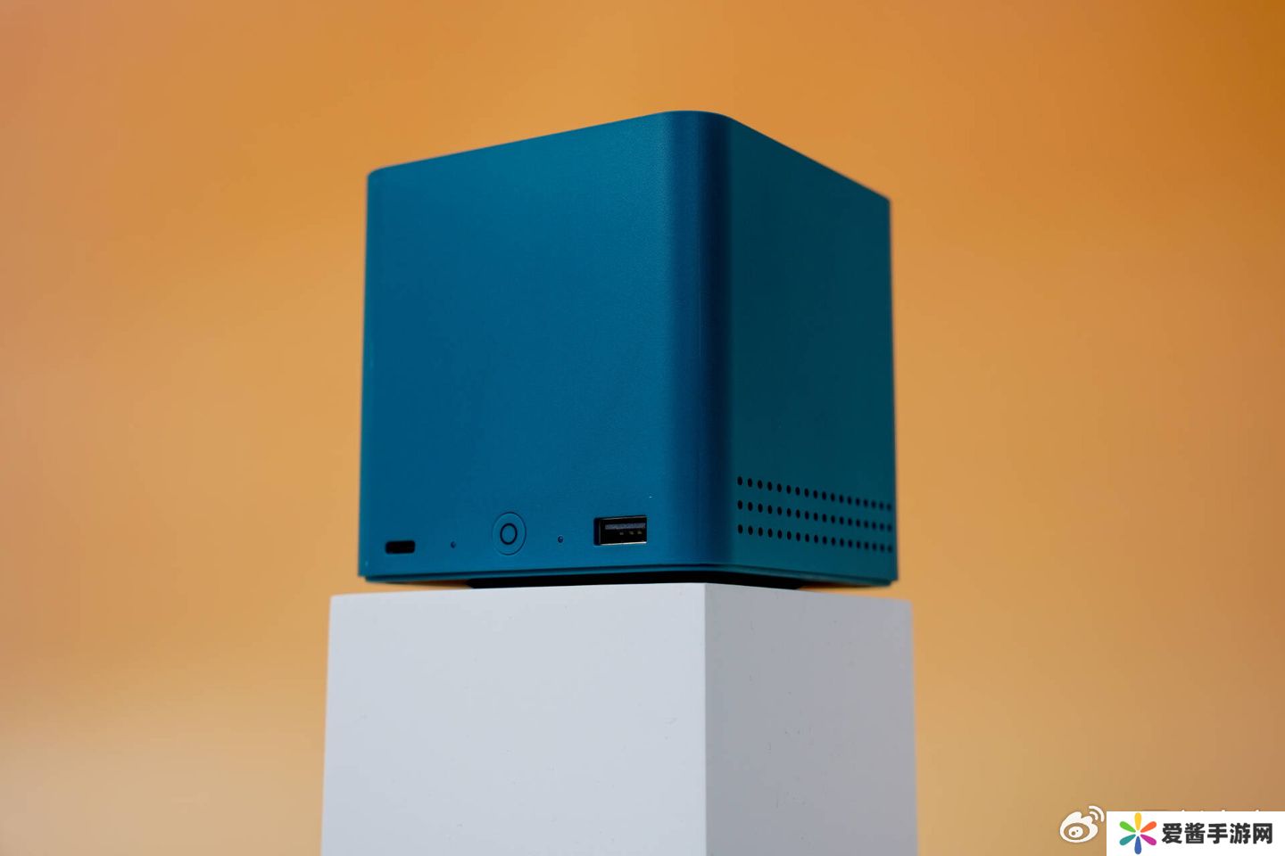 这款小主机采用了内置电源设计,尺寸为 99×99×98.3mm,重约 730 克,提供珍珠白、孔雀蓝、暗夜灰三种配色。