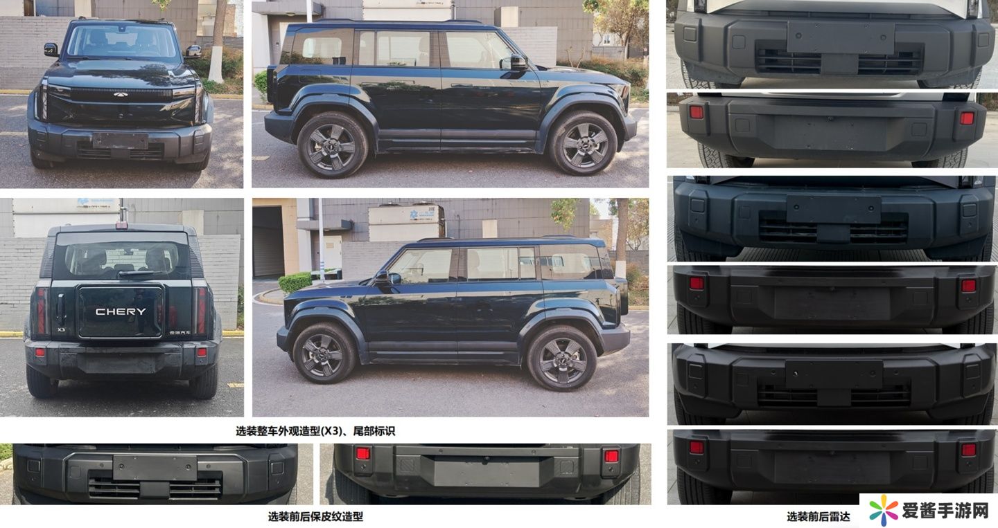 从图中可以看到,该车采用黑化外观、方盒子造型,尾部有大大的 CHERY 英文标志。