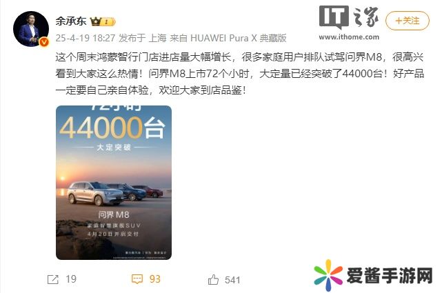 本站 4 月 19 日消息,华为常务董事、终端 BG 董事长余承东刚刚发文,宣布问界 M8 上市 72 个小时大定突破 4.4 万台。除此之外,享界 S9 增程版上市 72 小时大定破 5200 台。